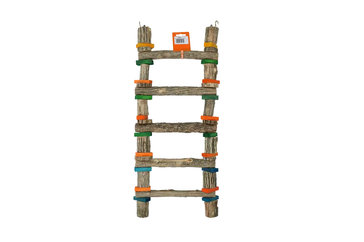 En farverig stige med et naturligt look. Velegnet til store fugle. Let at hænge med de medfølgende beslag. Kan også bruges som ind- og udgangshjælp.