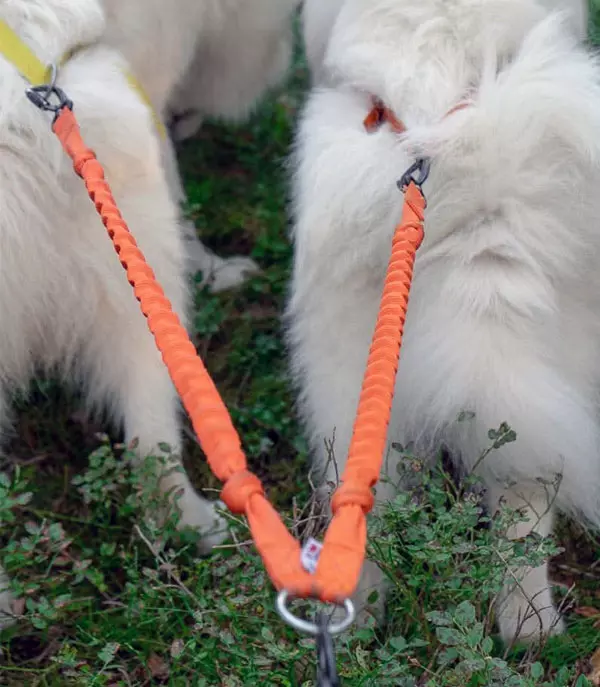 Rykkdemping for økt komfort I motsetning til vanlige haneføtter i stiv nylon, har denne modellen en innebygd 8 mm kraftig strikk. Dette er spesielt gunstig dersom hundene har ulikt tempo eller hvis en av dem gjør plutselige utfall. Strikken skåner hundenes nakke og rygg, samt dine egne skuldre og håndledd.