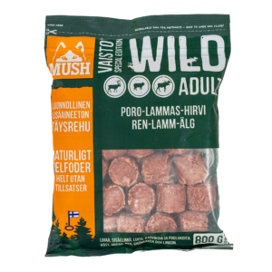 MUSH Vaisto® Pure-lam-elg ADULT Wild er et komplett fôr for hunder. MUSH Vaisto® ADULT Wild passer for alle voksne hunder, takket være utvalget av råvarer er produktet spesielt egnet for hunder med allergi eller sensitiv mage. Ben 8 %, lever 6 %.