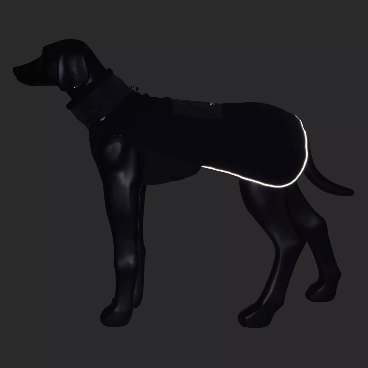 Jakken har et utmerket snitt som dekker hundens store muskelgrupper, noe som er viktig for å opprettholde varmen under aktivitet. Den høye kragen gir ekstra beskyttelse for nakken, mens den justerbare midjen og halsåpningen sørger for at jakken sitter perfekt på hunden din. For å sikre at dekkenet holder seg på plass selv under lek og høy aktivitet, er den utstyrt med elastiske benstropper for bakbeina.