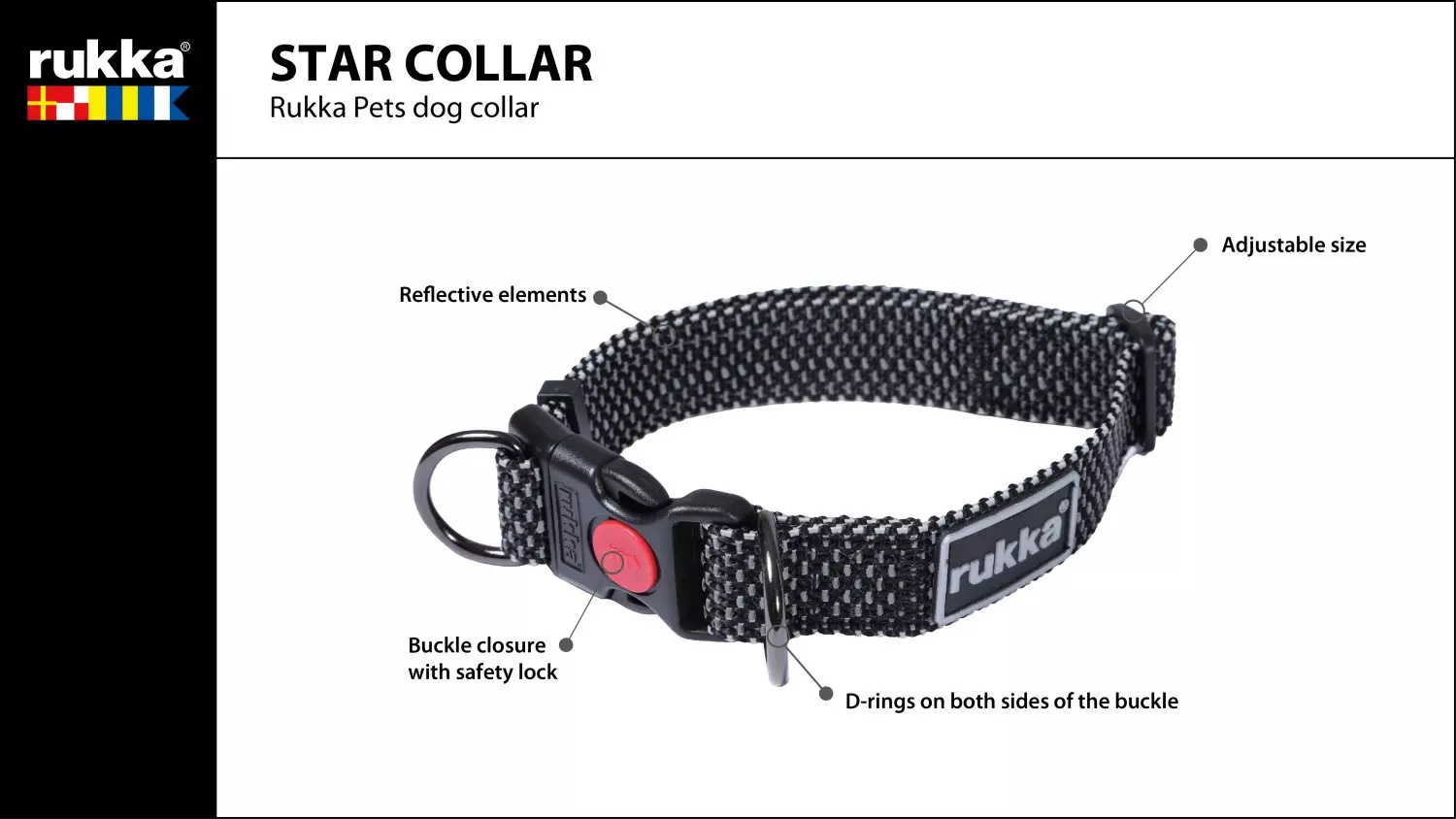 Rukka Star er svært allsidig og kan brukes både som et vanlig halsbånd med klikkspenne og som et halvstryk-halsbånd (semi-slip). Klikkspennen har i tillegg en integrert sikkerhetslås for ekstra trygghet. Alle metalldetaljer har en eksklusiv «gunmetal»-finish som tåler bruk over lang tid. Halsbåndet er maskinvaskbart og tørker svært raskt, noe som gjør det enkelt å holde rent i norsk vær.