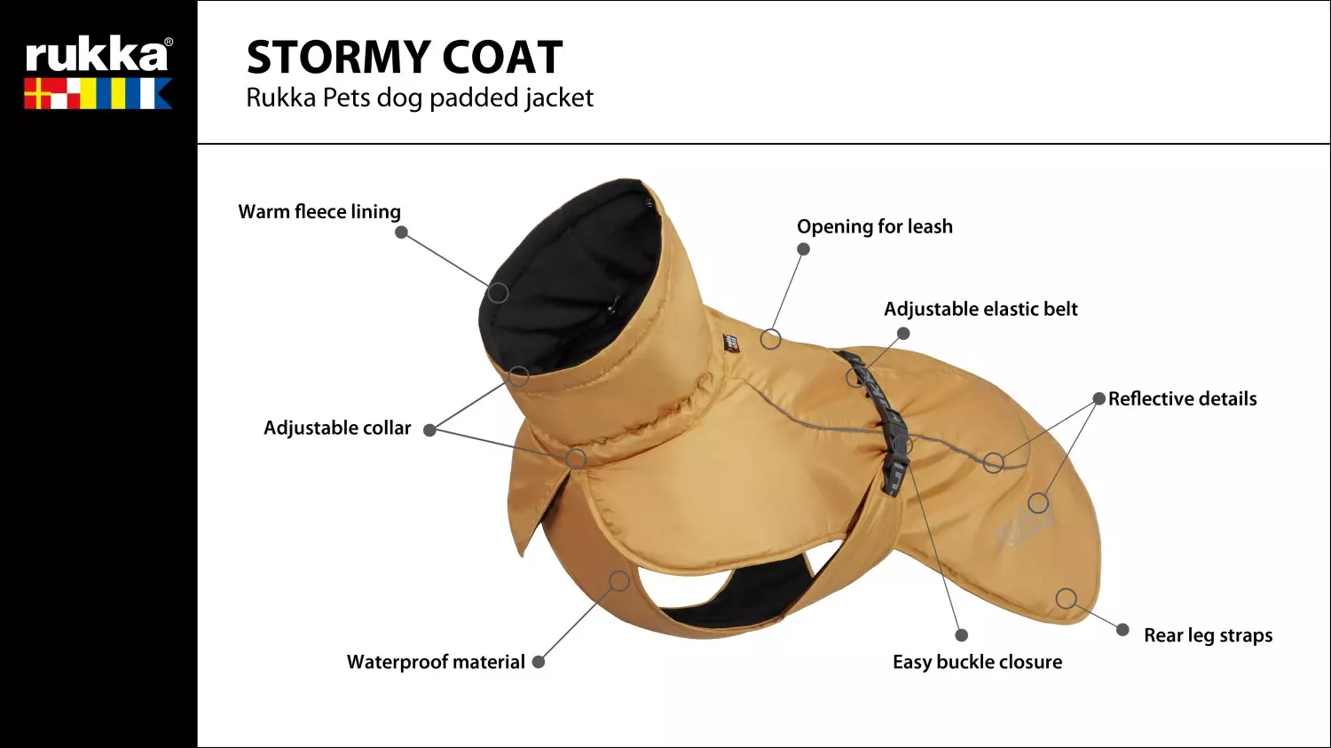 Rukka Stormy er et teknisk hundedekken utviklet for å holde hunden din varm og tørr under alle slags utendørsaktiviteter. Dette dekkenet skiller seg ut ved å kombinere isolasjon med maksimal mobilitet. Gjennom den innovative «half-cape»-løsningen er åpningene for frembeina kuttet helt opp til kragen. Dette gir hunden full frihet til å bruke naturlige bevegelser, noe som er avgjørende på lengre turer og under lek.