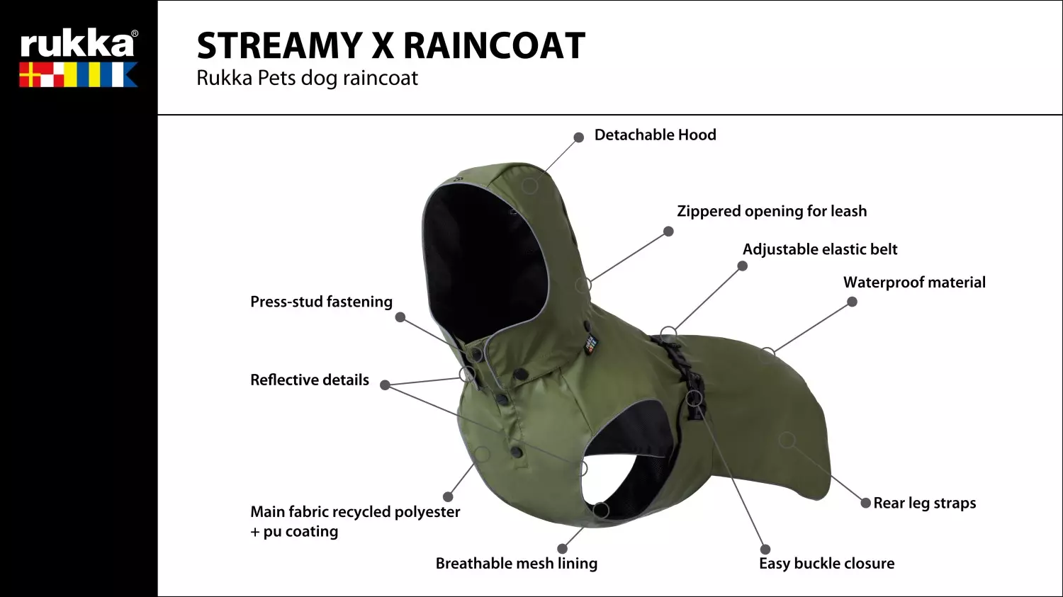 Påkledningen er rask og uproblematisk takket være en kombinasjon av trykknapper i front og en solid hurtigspenne over ryggen. For dager med ekstra kraftig nedbør og vind, gir den avtakbare hetten maksimal beskyttelse for hundens hode og nakke.