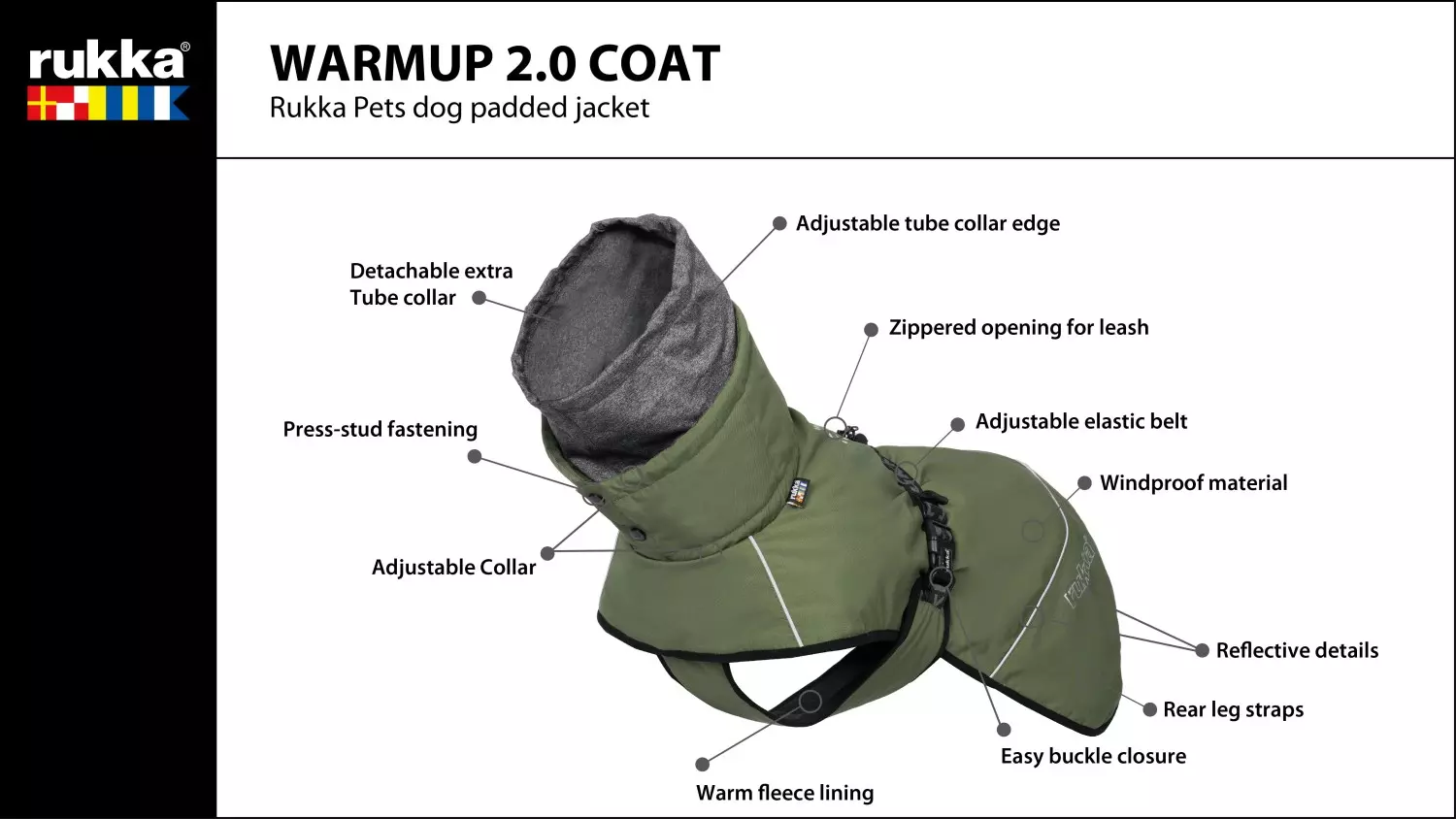 Rukka Warmup 2.0 er et teknisk plagg i toppklassen, utviklet for å beskytte hunden din mot skiftende og utfordrende værforhold. Dette dekkenet er ideelt for å holde hunden varm både før og etter trening, eller som et solid vinterdekken på kalde dager. Det lette yttermaterialet er laminert med en vann- og vindtett membran, som holder fuktighet og kulde ute.